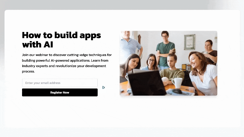 Here’s an example webinar landing page with a first load animation and a button hover animation. The animations were created with this prompt: