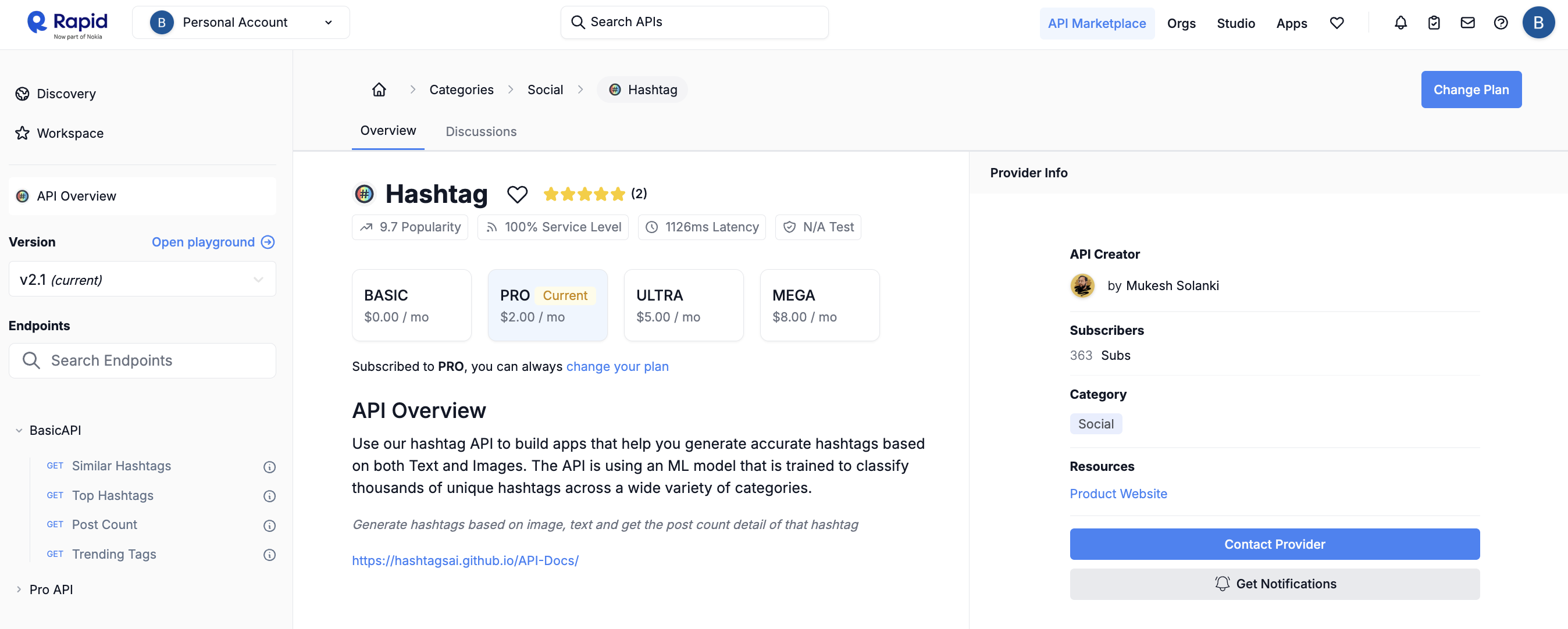 - Go to https://rapidapi.com/mukeshsolanki1/api/hashtag5/pricing