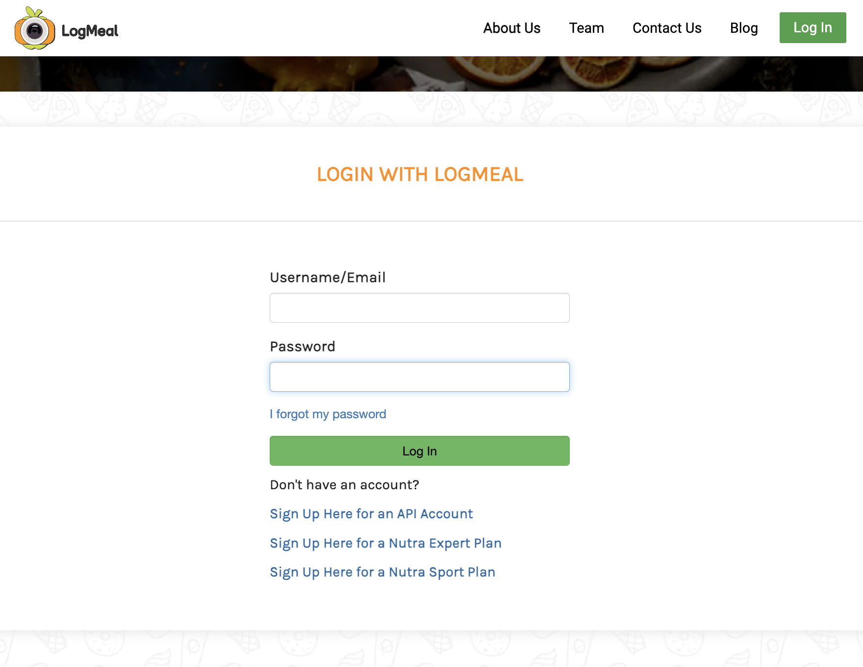 Go to logmeal.com/ and click “Sign Up” in the top right corner